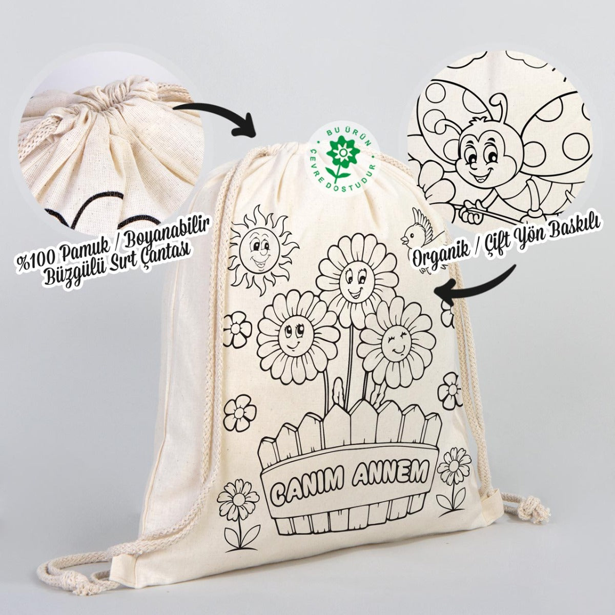 - Çift Taraf Baskılı Bez Çanta Boyutları 35×40 cm (+/- 1 cm değişiklik gösterebilir)