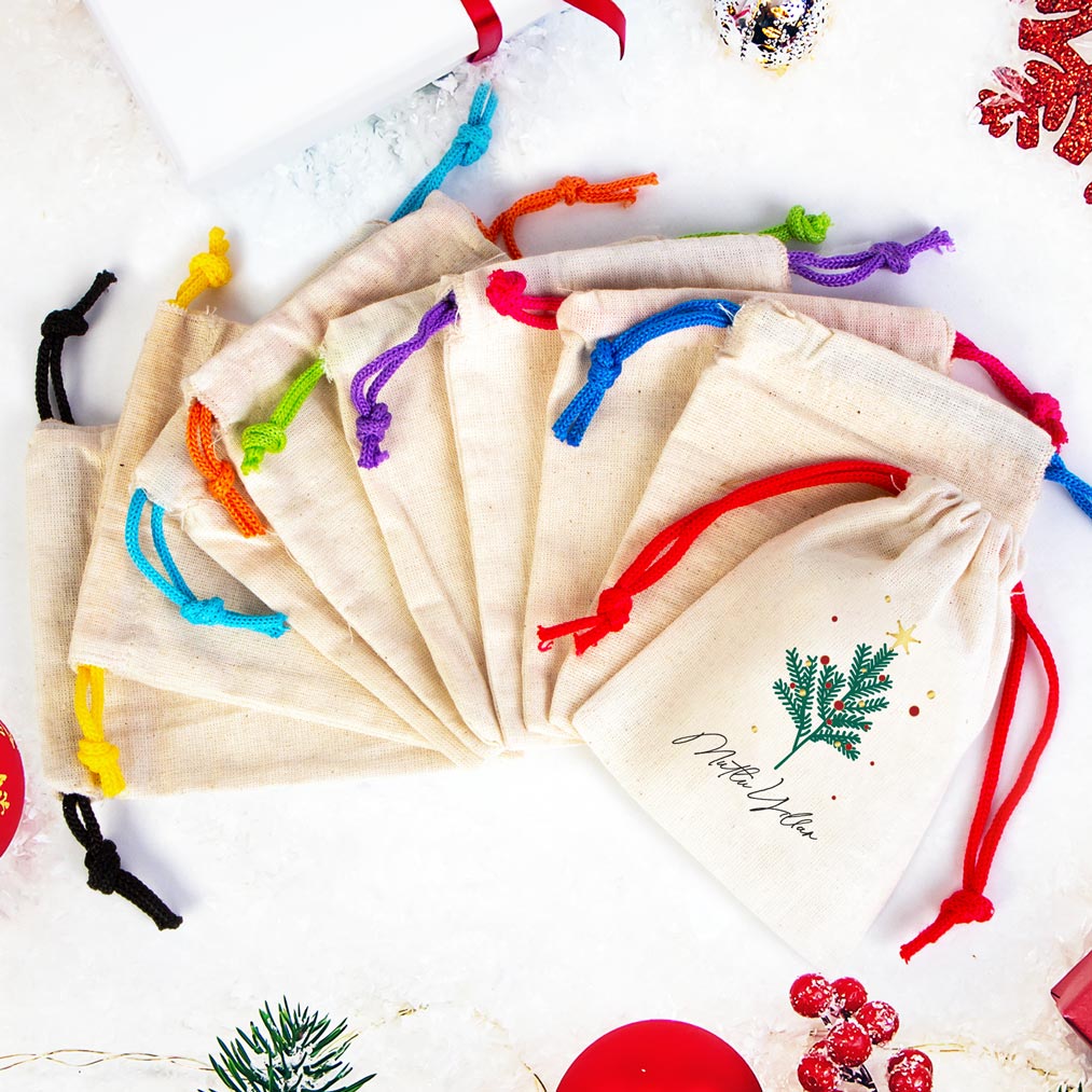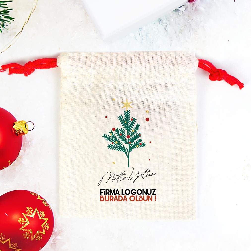 Çam Ağacı Baskılı Yılbaşı Hediye Kesesi – Renkli İp (Özelleştirilebilir)
