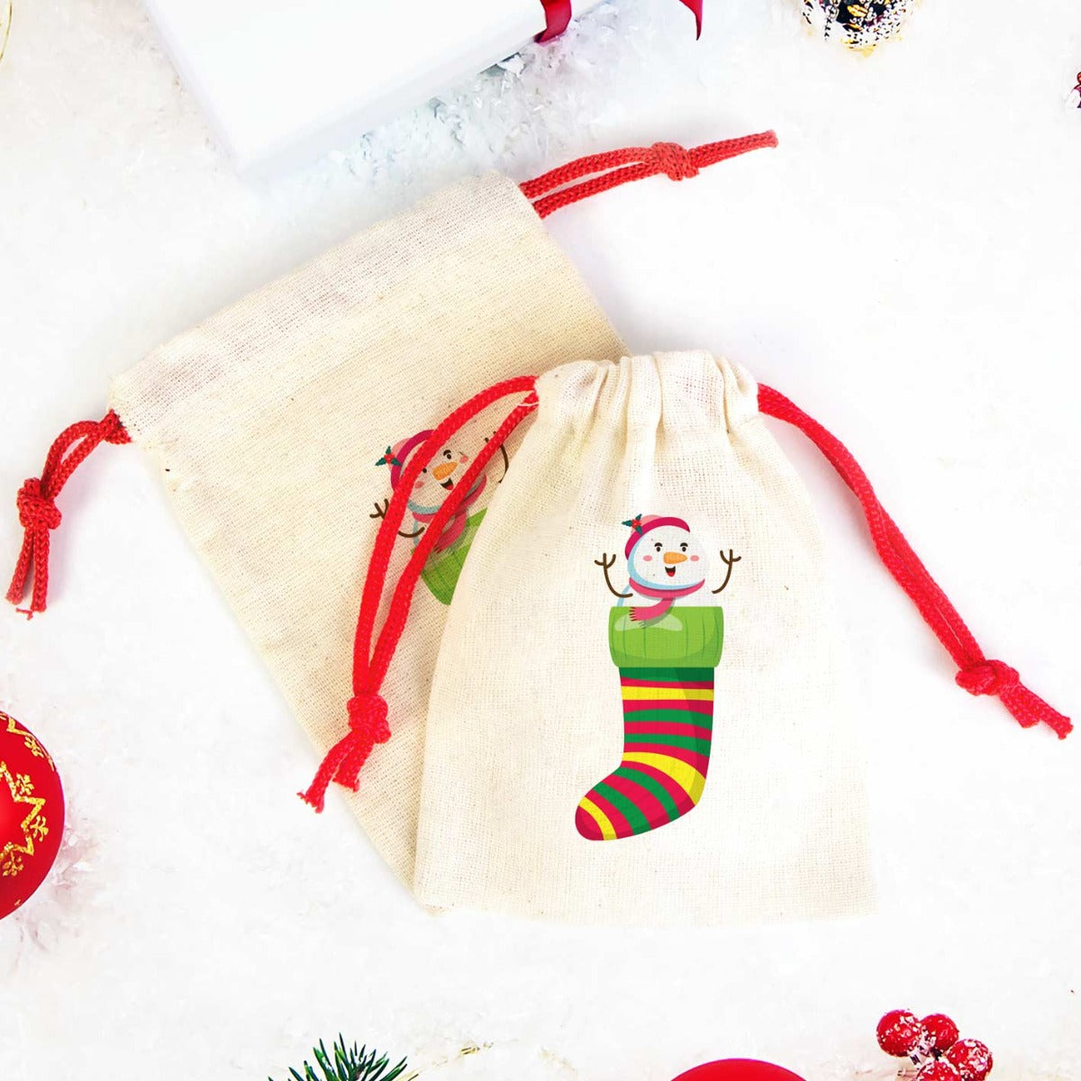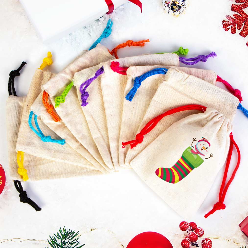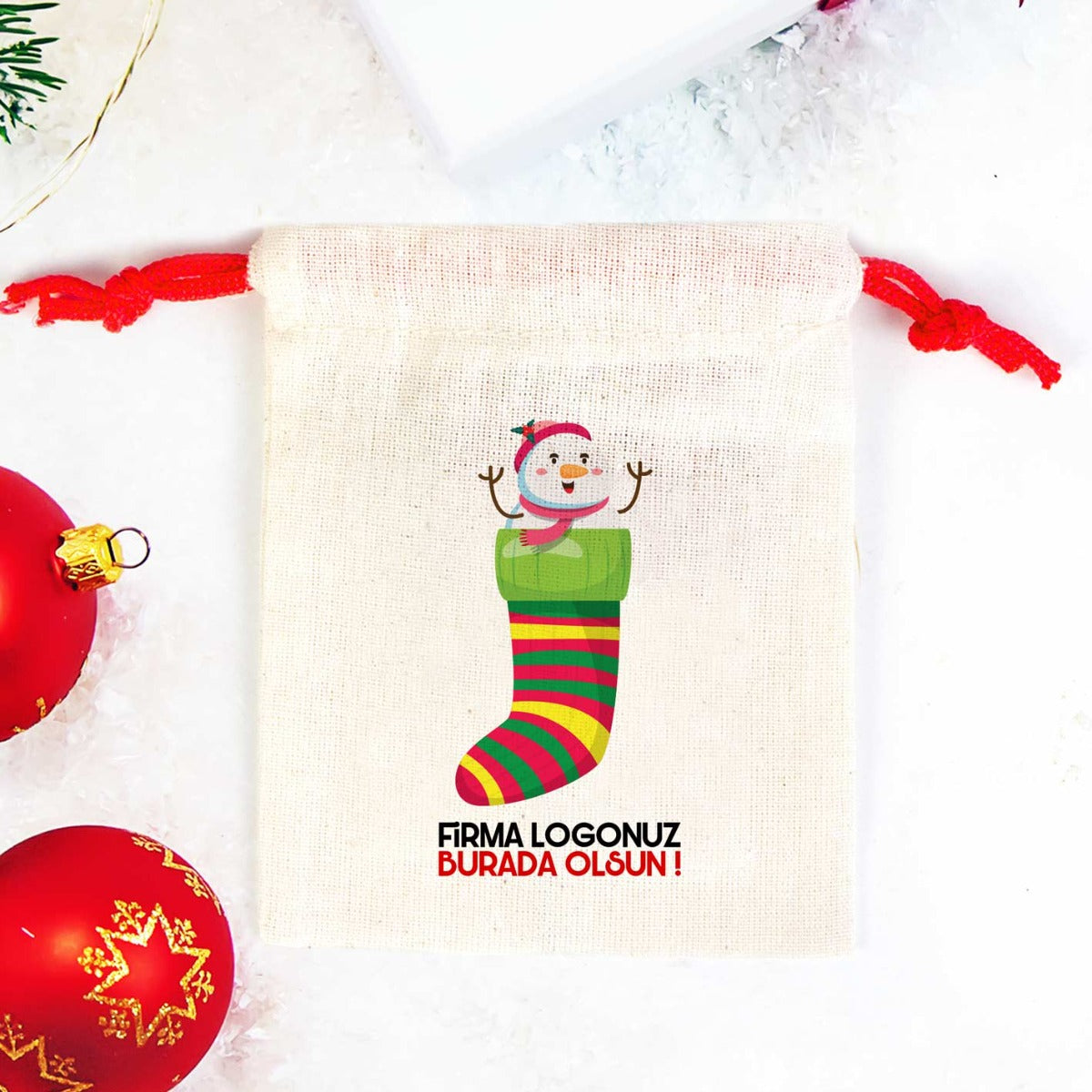 Kardan Adam Baskılı Bez Kese Modeli – Renkli İp (Özelleştirilebilir)