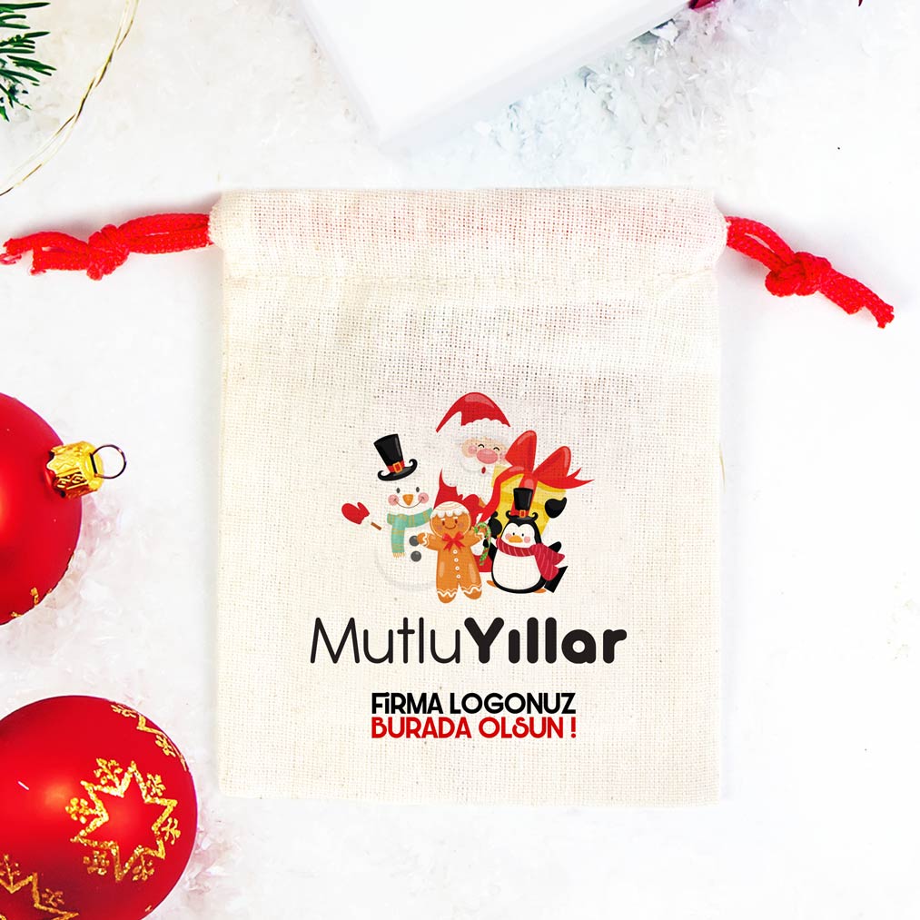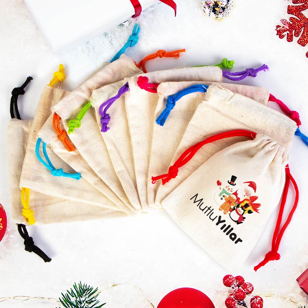 Mutlu Yıllar Baskılı Yılbaşı Bez Kese – Renkli İp (Özelleştirilebilir)
