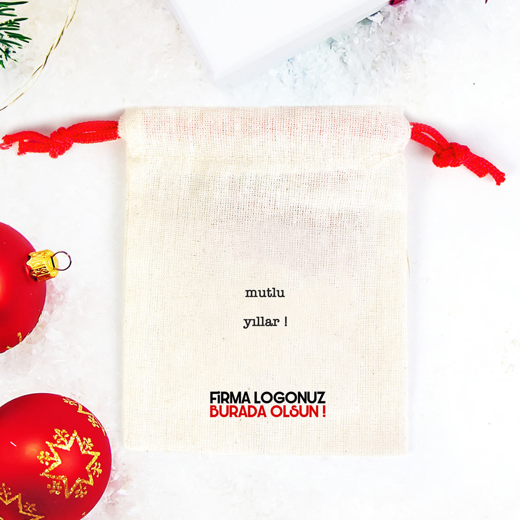 Mutlu Yıllar Minimalist Baskılı Bez Kese – Renkli İp (Özelleştirilebilir)