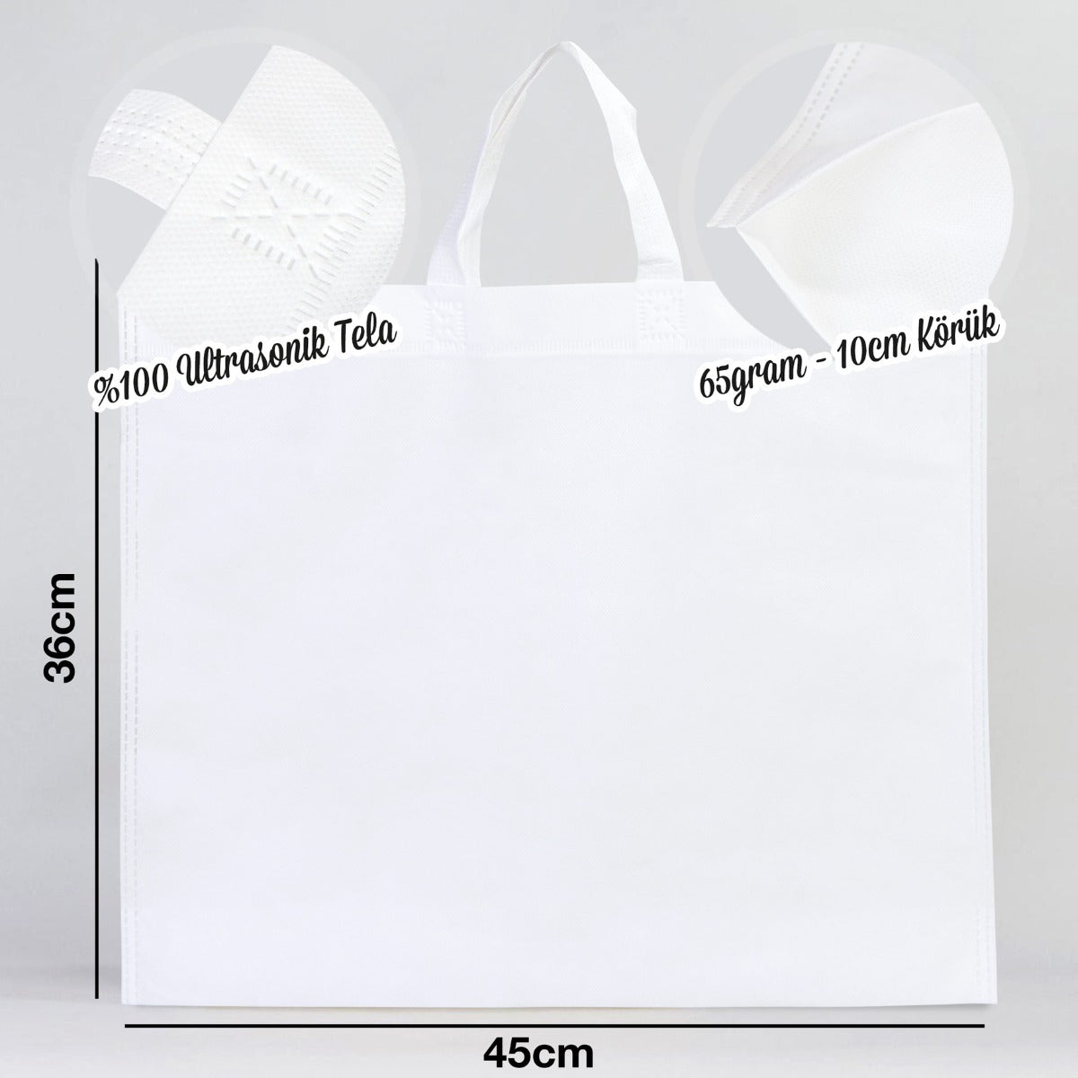- Ultrasonik Tela Çanta Boyutları 45x36x10cm (ürünler makine dikimi olduğundan +/- 1cm ölçülerinde küçük farklılıklar olabilmektedir)