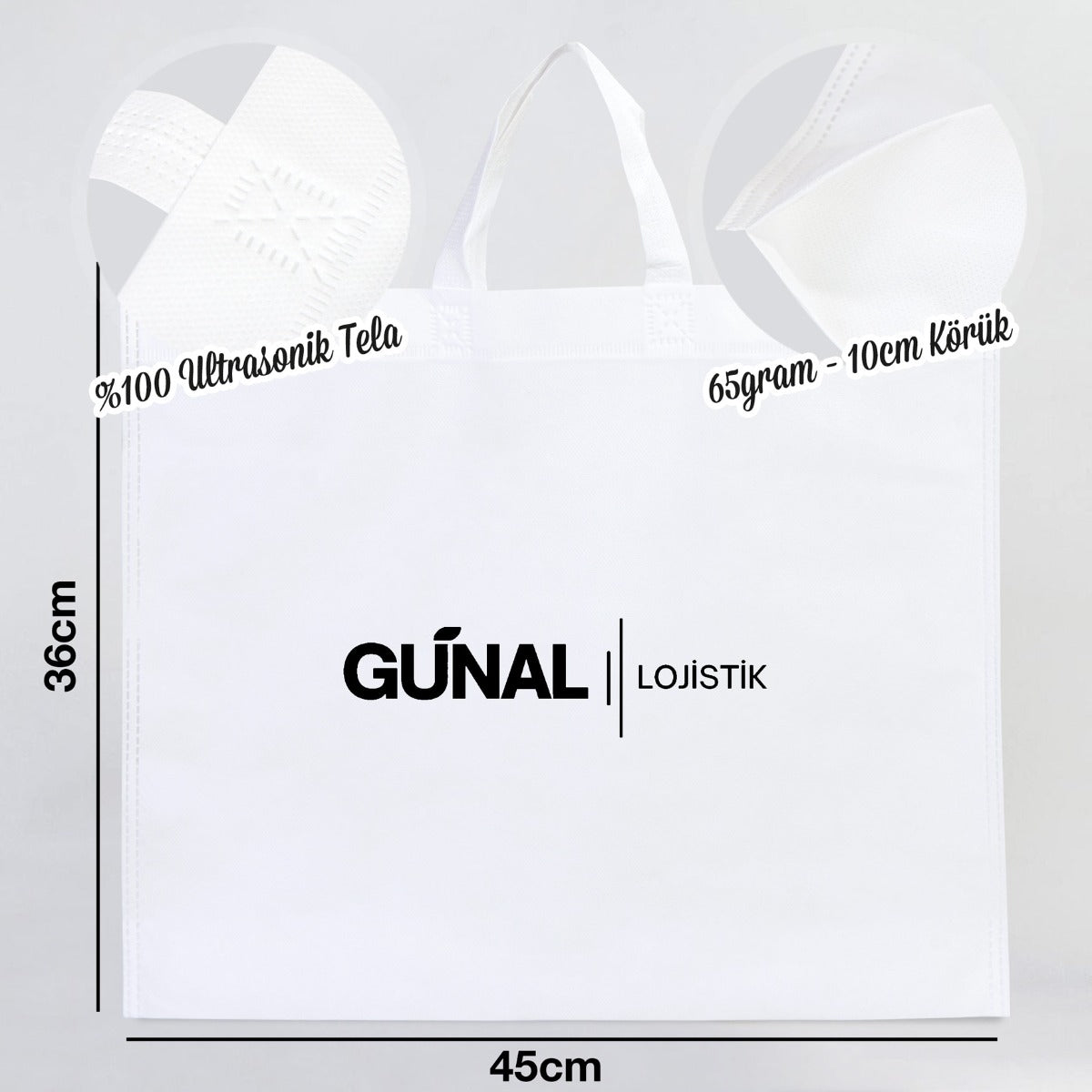 - Ultrasonik Tela Çanta Boyutları 45x36x10cm (ürünler makine dikimi olduğundan +/- 1cm ölçülerinde küçük farklılıklar olabilmektedir)