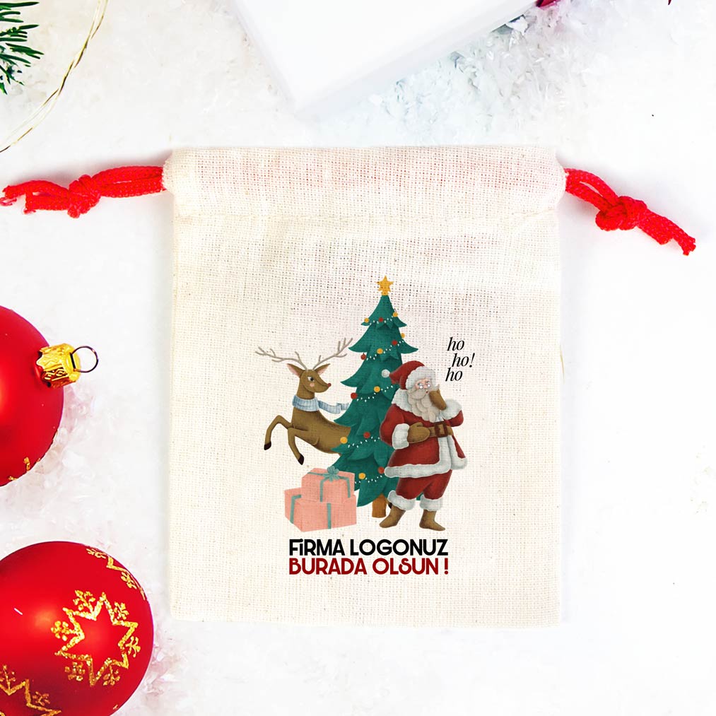 Yılbaşı Bez Kese Noel Baba Baskılı – Renkli İp (Özelleştirilebilir)